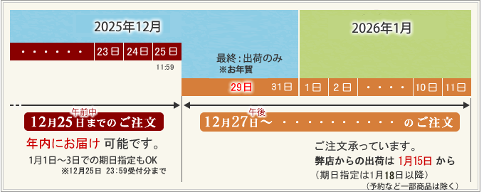 ● お年賀での受付: 12月25日23:59までに 「1月1〜3日配達希望」 で受付完了したものは